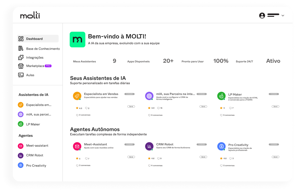 Conecte sua IA diretamente a WhatsApp, CRM e sistemas internos em operações integradas e fluida entre os times.